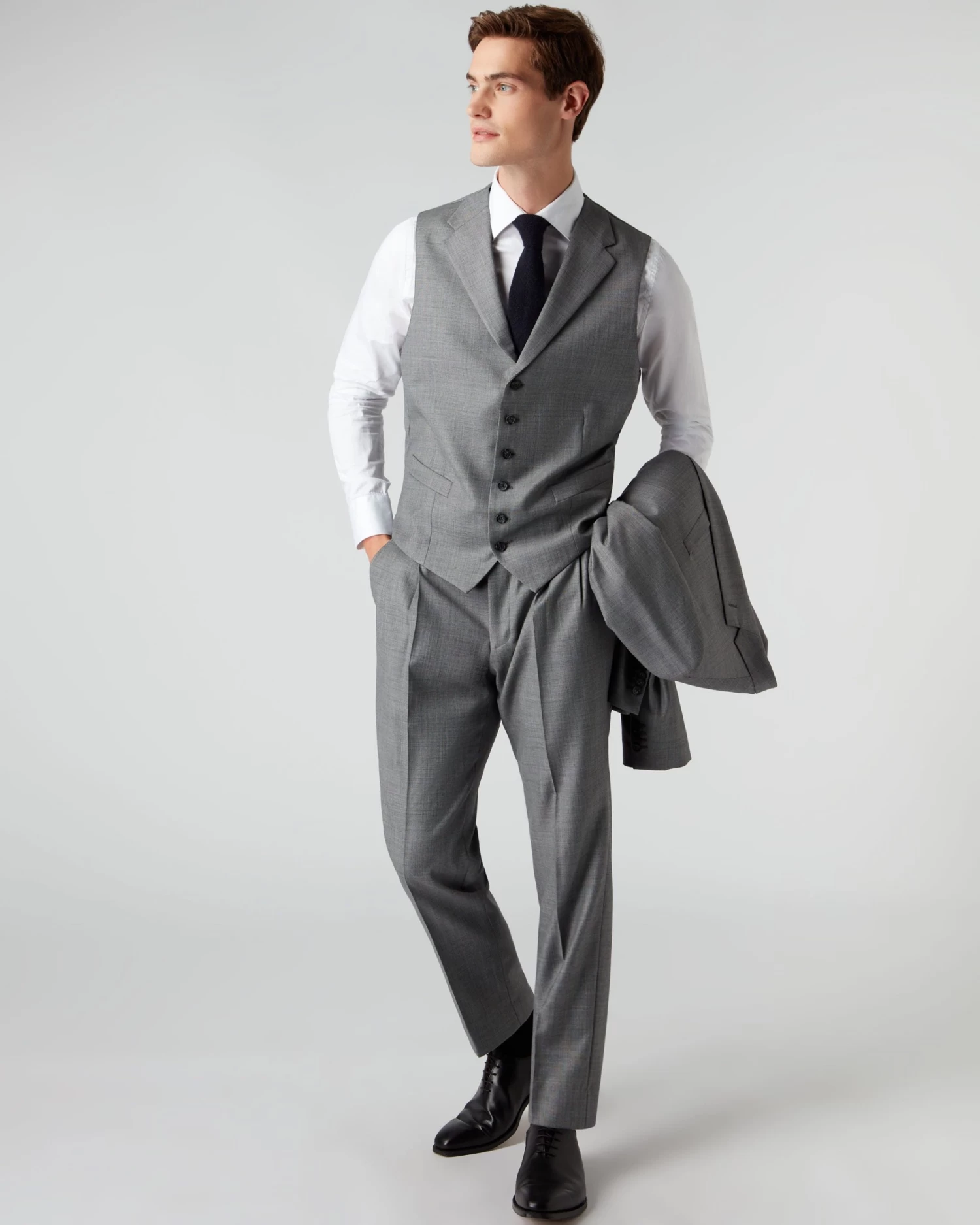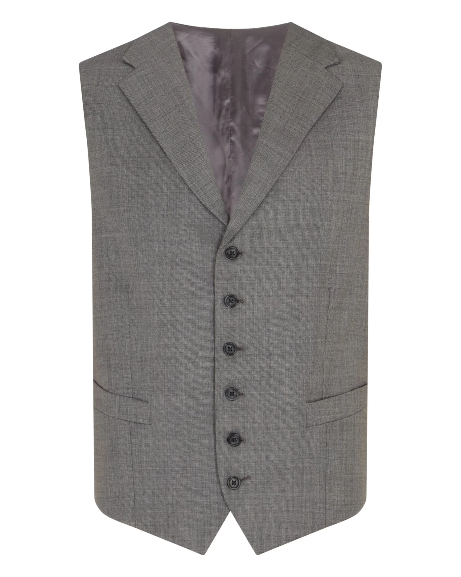 – Waistcoat: single breasted, six button fastening, grey viscose satin lining, notch neck lapel, welt pockets, standard back strap with buckle adjuster