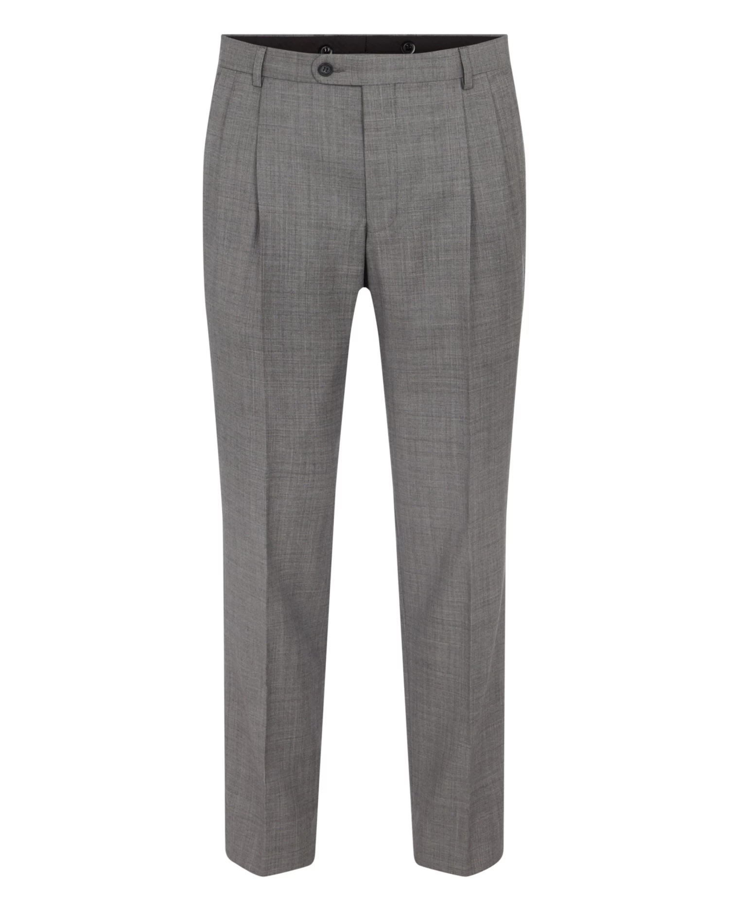 – Trouser: slim leg, double pleated front, slanted side pockets, back jetted pockets, regular rise, zip fly, belt loops, unfinished leg length so they can be altered, waistband suitable for alteration
