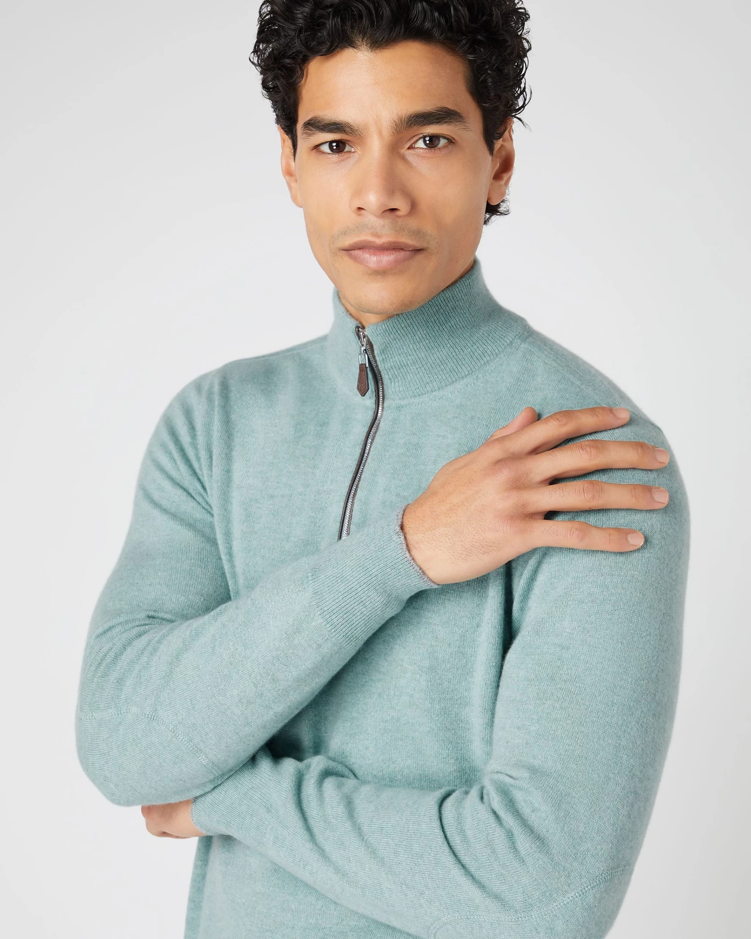 The Carnaby is shown here – a half zip cashmere sweater, beautiful in design and cut.