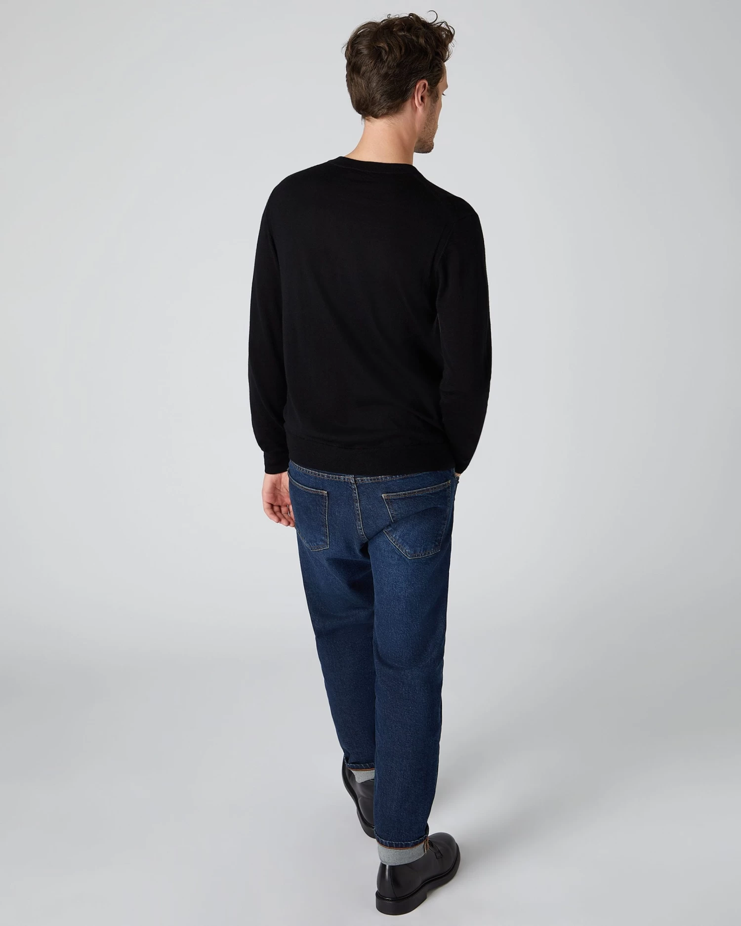Our popular fine gauge weight looks very well in the round neck sweater style.