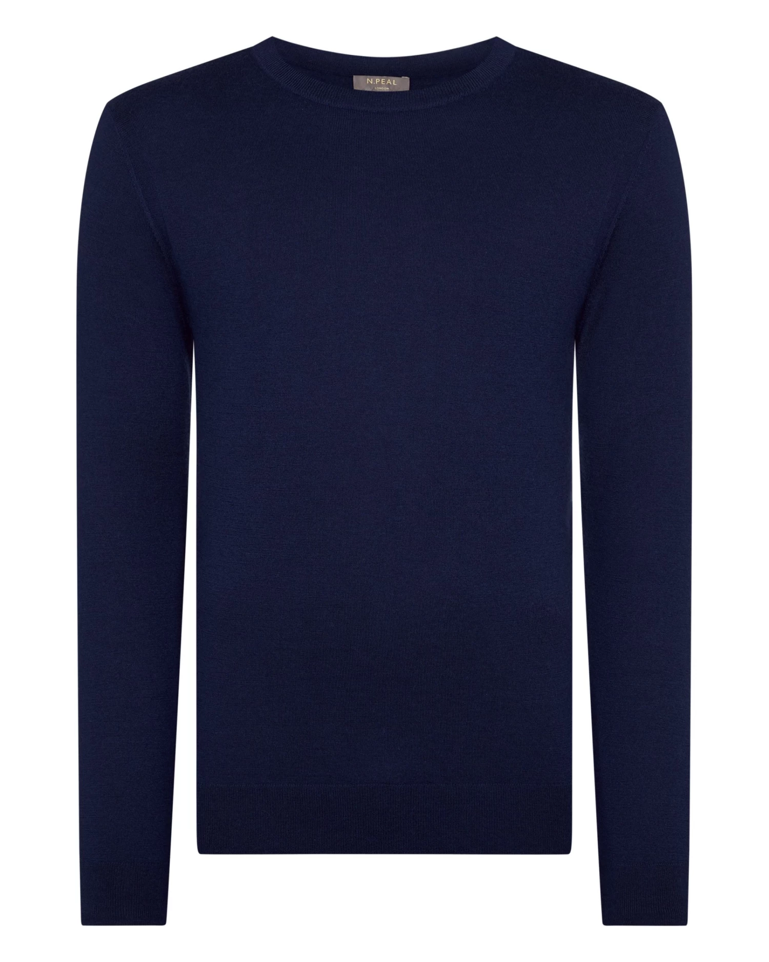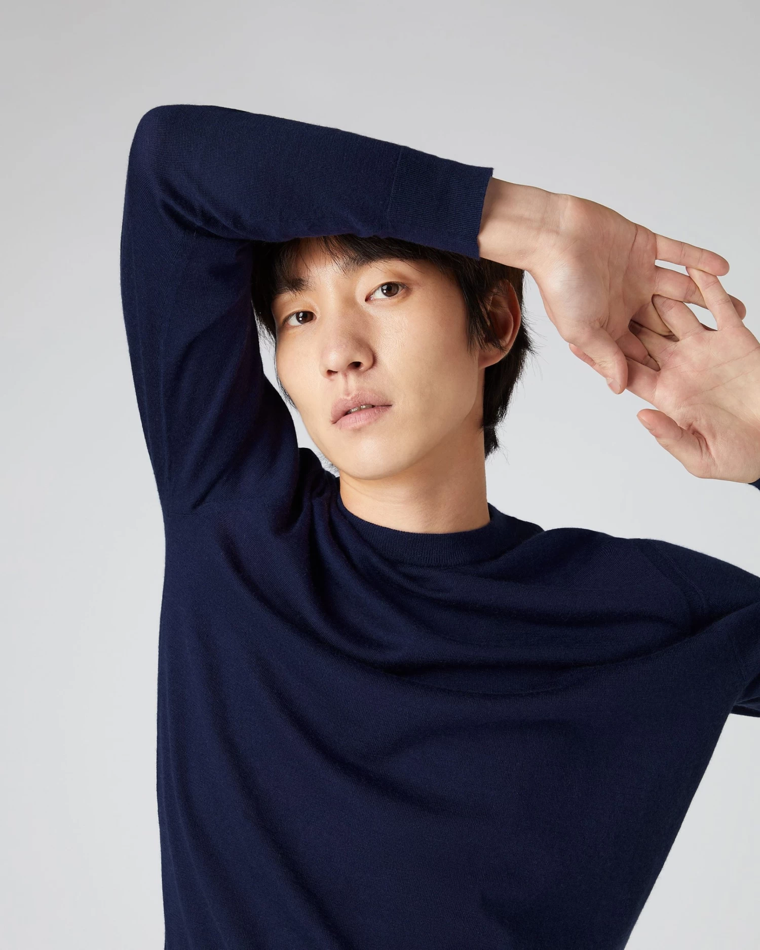 Our popular fine gauge weight looks very well in the round neck sweater style.