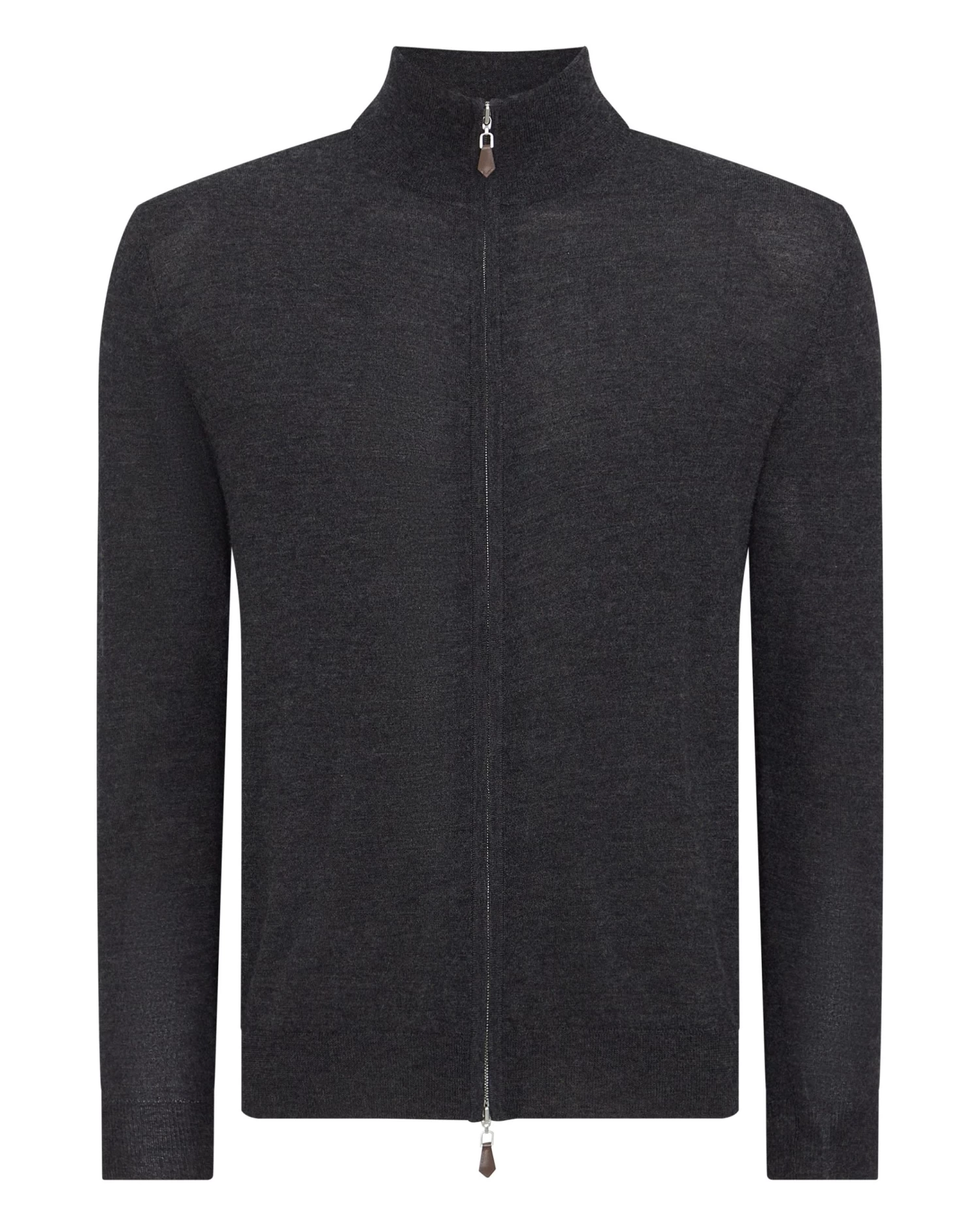 The Hyde is shown here, a fine gauge Summer weight zip sweater.