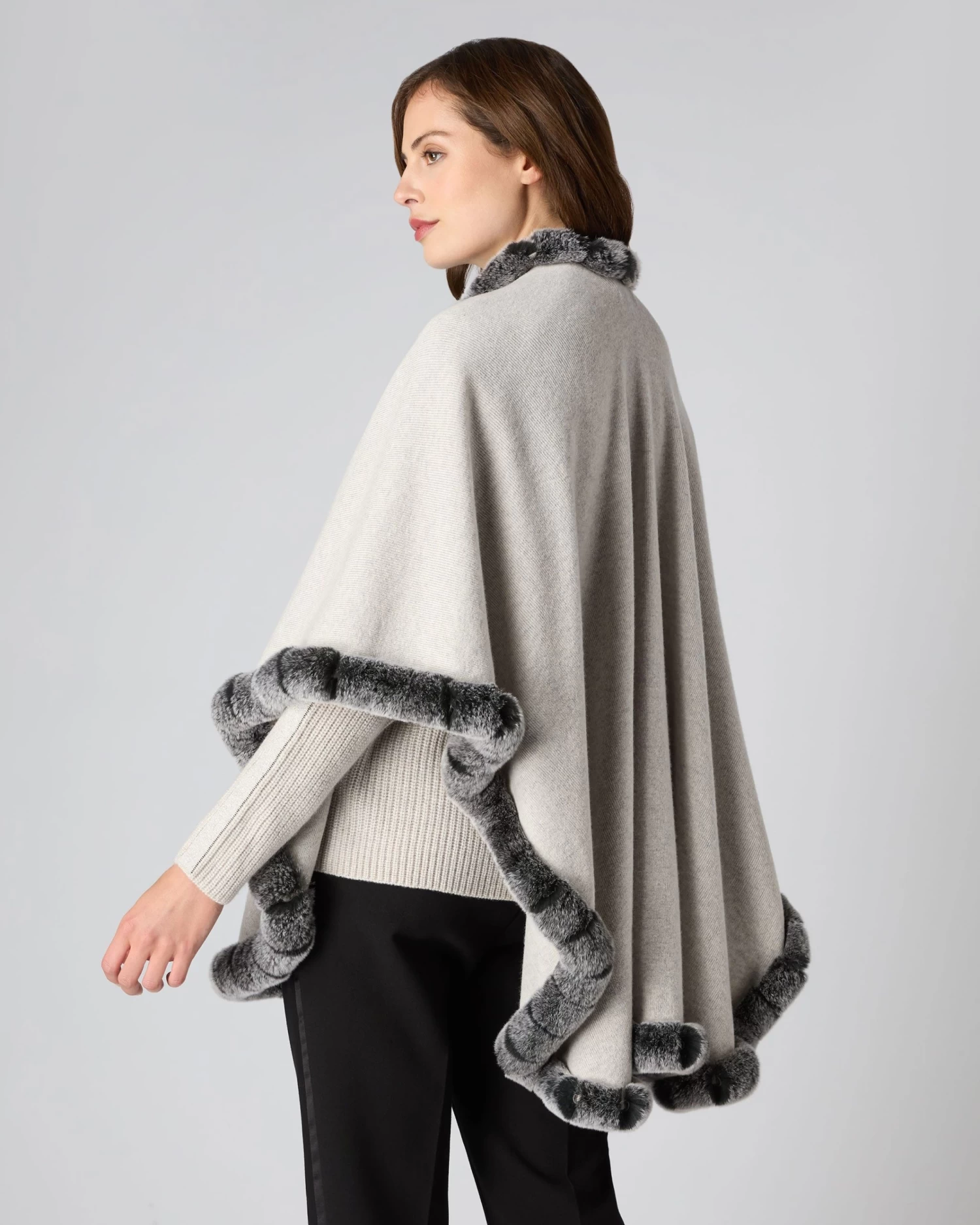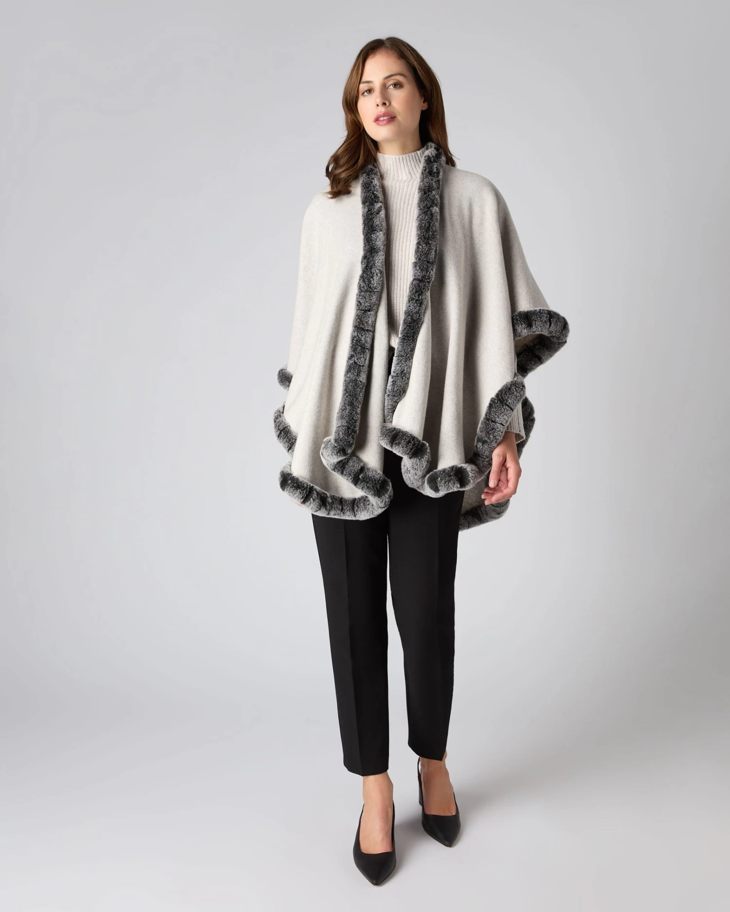 A fabulous cape embellished with a with fur trim edge.