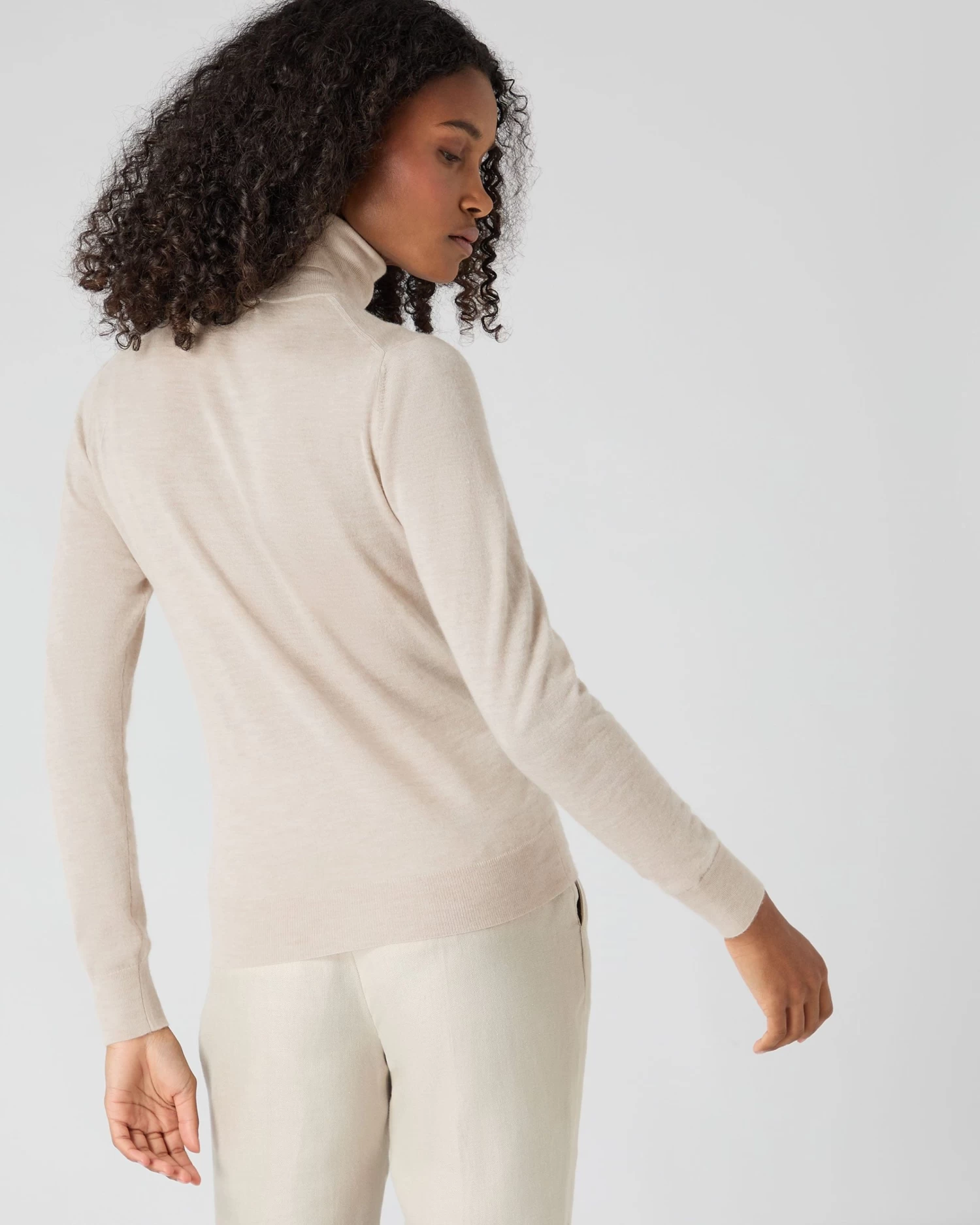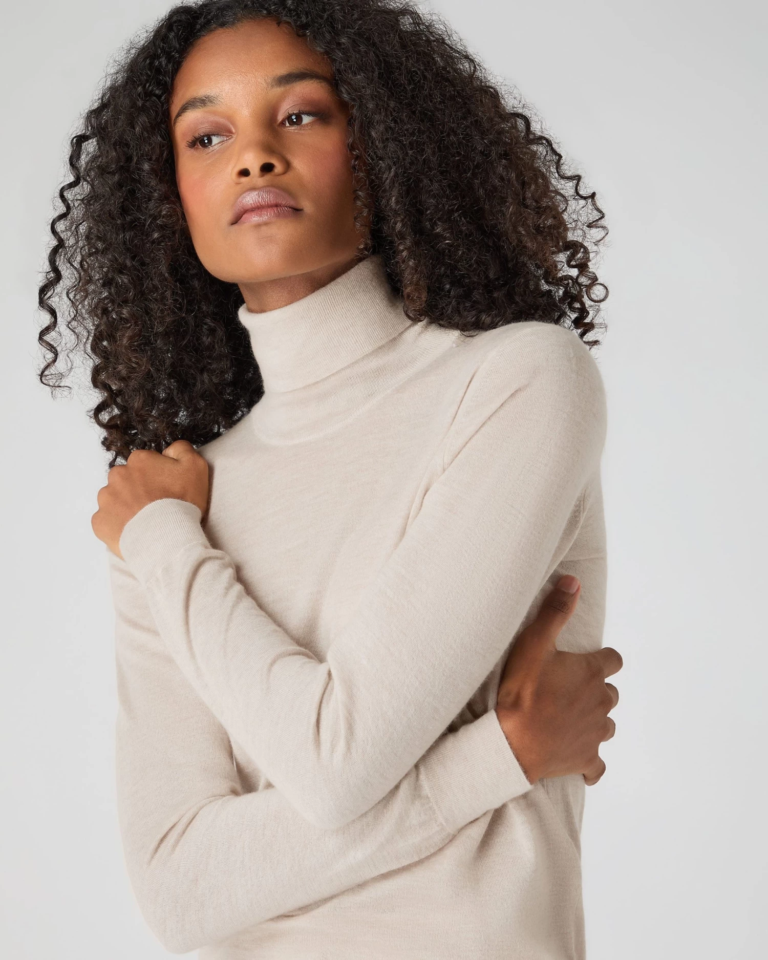 Envelop yourself in N.Peal Superfine – here in a roll neck cashmere sweater.