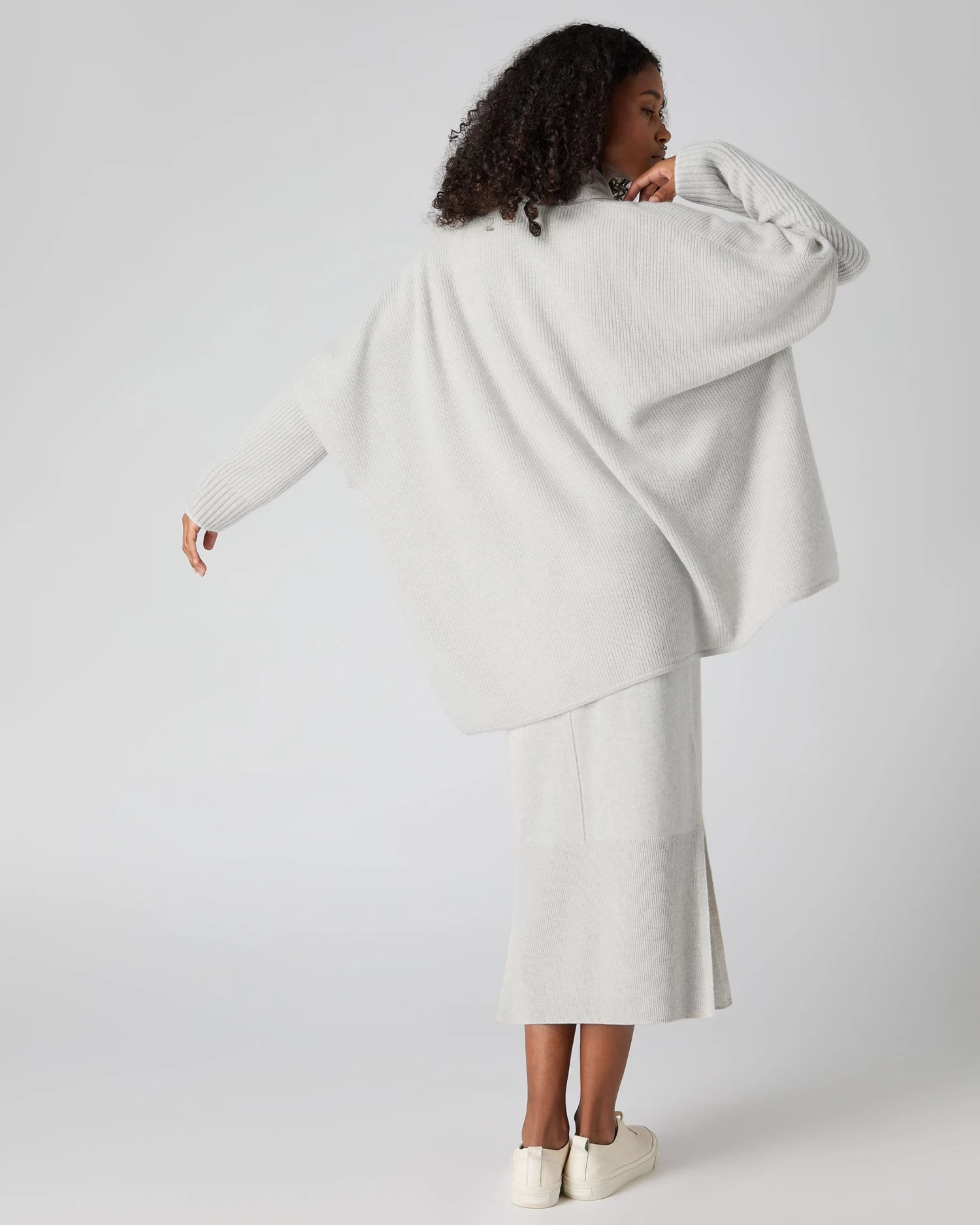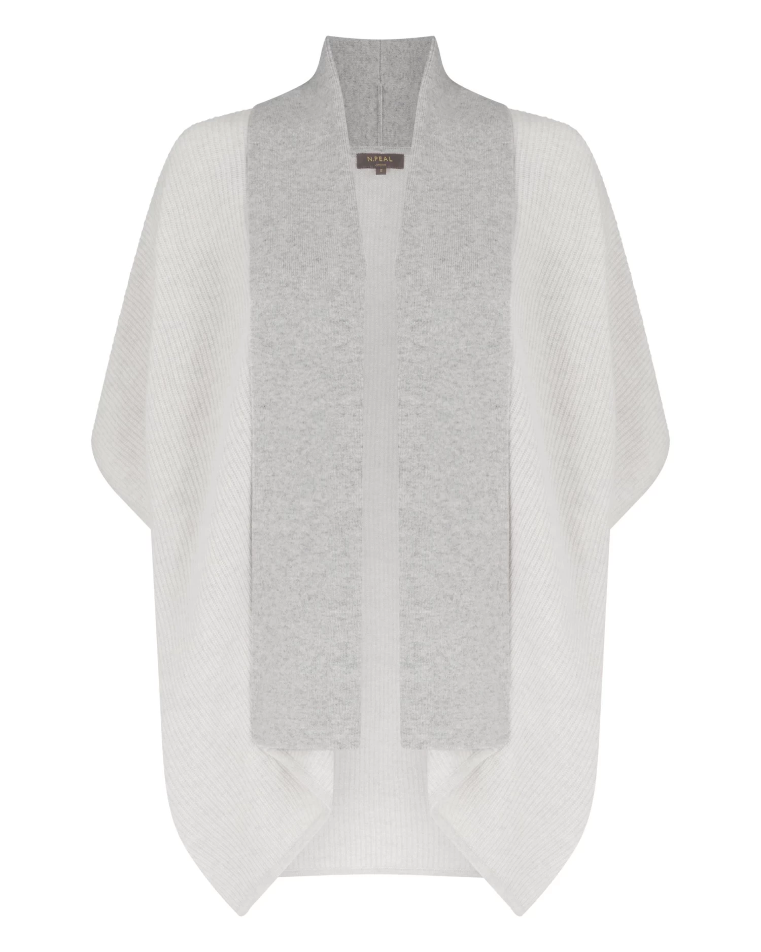 – Shawl collar style with a pebble rib stitch on the body and fumo grey plain knit contrast on the shawl section